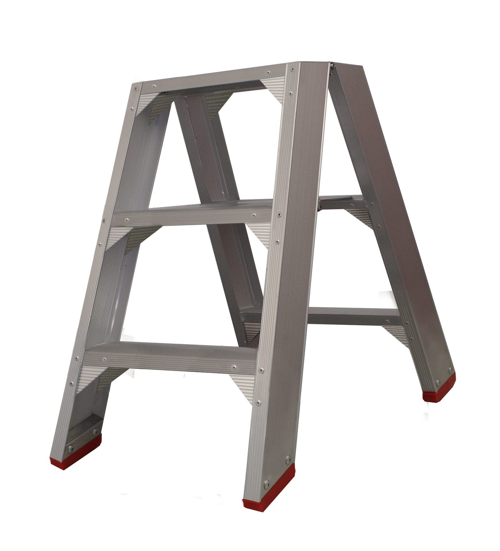 Oerdegelijke industrietrap met 4 schetsplaten en 12(!) popnagels in iedere trede. Het geanodiseerd aluminium is vuilafstotend en geeft niet af (geen vuile handen). De 10 cm diepe treden en het grote bordes zorgen voor een comfortabele werkplek. Bij de dubbel oploopbare trap is er een tweede stabordes dat als spreidbeveiliging fungeert. Vanaf 2×3 treden compleet geleverd inclusief verplichte steunbeugel (ARBO).