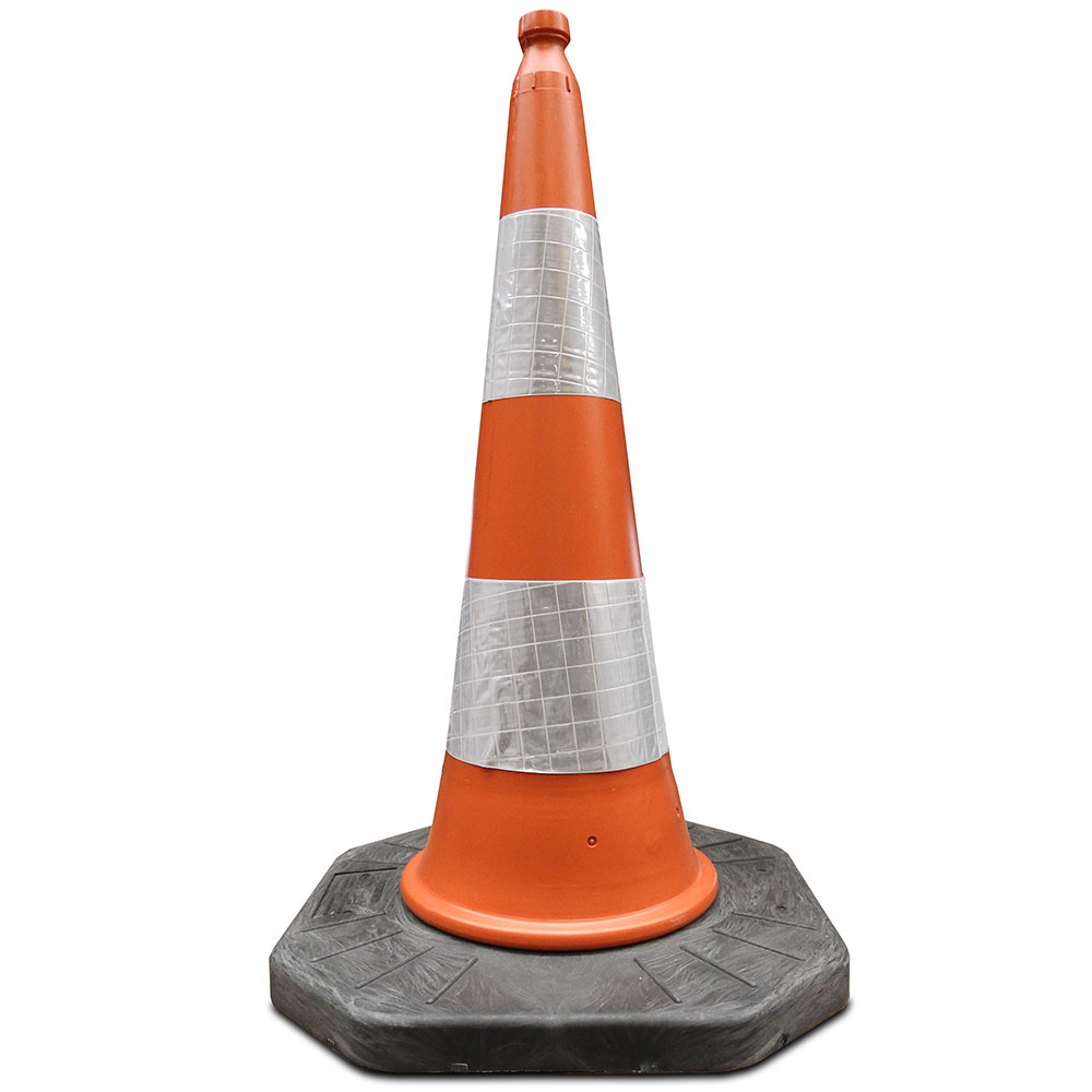 Zware afzetkegel van 100 cm hoog van oranje kunststof met twee klasse 2 reflectie banden. De zware afzetkegel weegt 7 kilo, waardoor deze gebruikt kan worden tijdens alle weersomstandigheden.