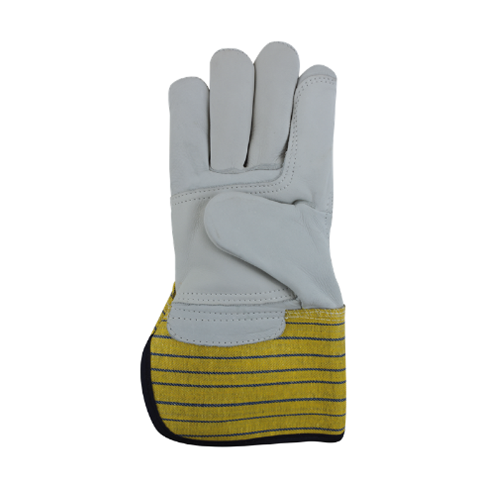 Linker splitlederen handschoen, gevoerd met rundlederen palm en vingertoppen, katoenen rug en 7 cm gerubberiseerde kap. Ideaal voor dakwerk.