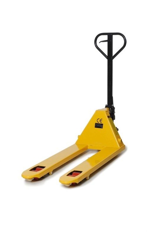 De standaard oersterke palletwagen met rubber stuurwielen en polyurethane vorkrollen in tandem uitvoering.